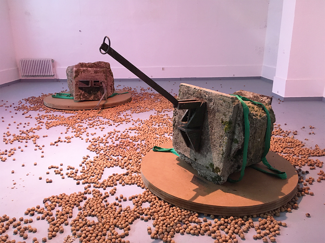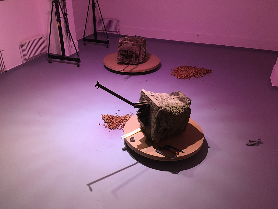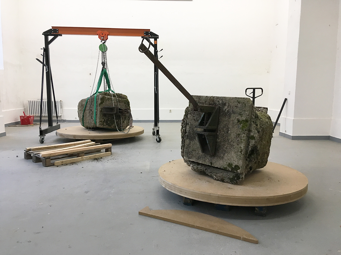 Diplomová práce Andrey Sobotkové se vztahuje k její site specific instalaci pro pardubický festival umění ve veřejném prostoru „Tvárnost paměti“, kterou na diplomové výstavě také prezentuje. V prostoru bývalého vojenského cvičiště, dnes postupně pohlcovaném přírodou, se zachovaly zbytky technických staveb a železniční infrastruktury. Sobotková zviditelnila jejich původní funkci dočasnou instalací překlenující mostní pilíře. V blízkosti jednoho z nich objevila rezidua manipulačního zařízení zapuštěná do betonových základů – dva fragmenty vytržené ze země –, které nyní přenesla do výstavního prostoru. Tyto artefakty, připomínající geologické vzorky – zatuhlé, hrubé a ve stavu pomalého rozkladu –, vnímá jako autentické otisky paměti původního místa a zachází s nimi, jako by šlo o živou hmotu pohybující se v prostoru.