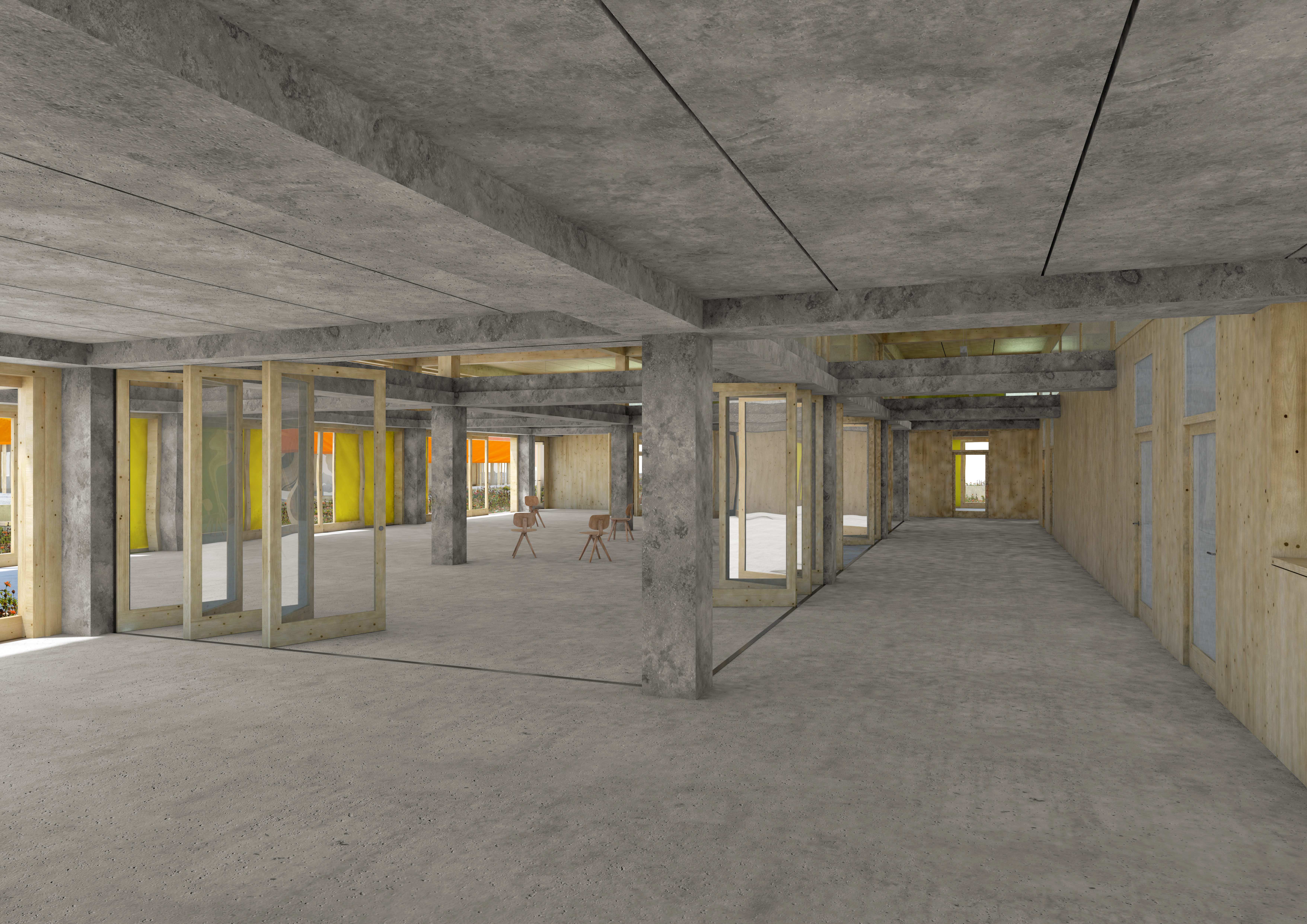 Klára Vejvodová si pro svůj projekt vybrala lokalitu bývalého obchodního centra Nisa, jedné ze čtyř obdobných staveb, které byly na sídlišti v Bohnicích postaveny. Zkoumá, zda nízká horizontální stavba v obležení vertikál panelových domů, místo se zvláštním kouzlem, musí trpně čekat na svůj zánik a uvolnit svou prominentní polohu, která jí byla původně vyhrazena, novému soukromému developerskému projektu. Klade si otázku, jestli vymazáním takovéto stavby z přítomnosti sídliště ještě více nestvrzujeme opomenutí minulosti a jestli současná výstavba v těchto lokalitách není stejně monofunkční nebo uspěchaná jako ta dřívější. Hledá možnou odpověď na způsob nakládání s nevyužívanými budovami komunistické éry a zároveň ve svém projektu uvažuje o nárocích na prostor „mezi“ bydlením. Zkoumá současný směr vývoje konceptu pracovní doby, jeho hranice a z toho plynoucí požadavky na proměnu místa pro práci, pro kterou sídliště nebylo určeno.